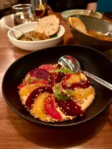 The young gentleman who attended to our table was friendly, knowledgeable, and shared his recommendations on what to order, but was not pushy. I ordered bheja masala and haleem, the latter being recommended by our friend Neville, a food fanatic. K chose achari beetroot, summer oranges, and tadka dahi to complement the meat. While we waited for our food, a young chef came out and introduced himself as Yash Raj, the restaurant’s head chef. He offered to send us half portions so we could sample other dishes. I eagerly accepted and ordered the chicken liver masala, which I had been eyeing. K firmly said she wanted a full plate of the salad. I couldn’t resist ordering the pav bhaji after seeing its picture in write-ups about the place. Chef explained that Comorin’s philosophy is to showcase India’s street food. I was sceptical. Could chefs in a ‘fancy’ place resist the temptation to reinterpret or re-engineer the food?