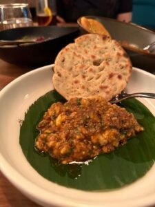 We entered Comorin, located in what used to be K’s office complex during her time at JWT. We found ourselves in a stylish yet sophisticated setting, well lit (though not Instagram-worthy). Her only complaint was that the temperature was a little too cold. I agreed. We were guided to a booth at the end of the seating area. You were part of the restaurant, yet there was a sense of intimacy. We could hear each other speak, and we saw people across the tables happily chatting as they dug into their food. It was not one of those wildly loud places; it was a spot for grown-ups.