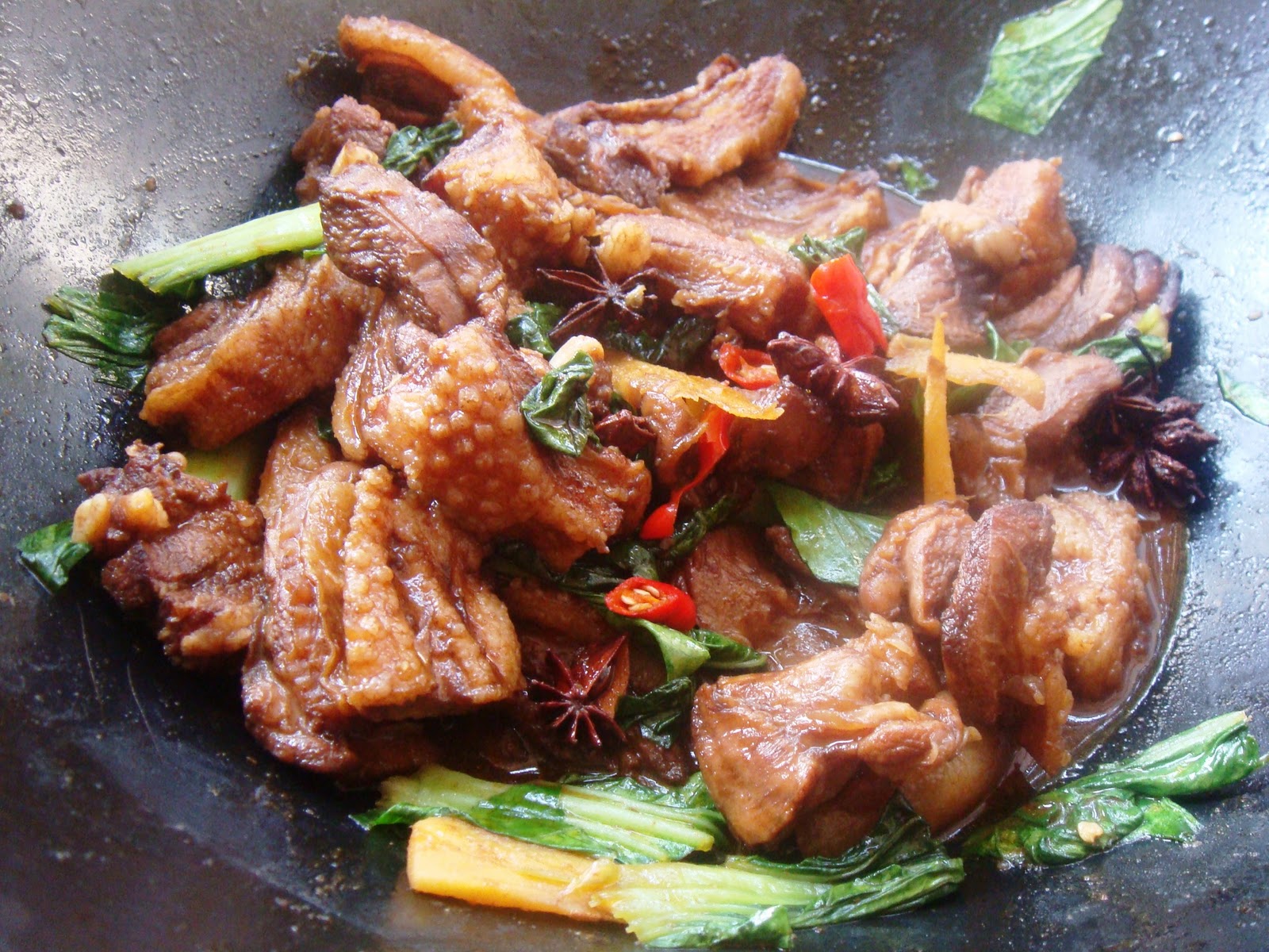 I tossed the rest of the pork in a wok, on the morning of the shoot, and stir fried it with with star anise, ginger slices and threw in some sliced red chilles and bokchoy at the end.